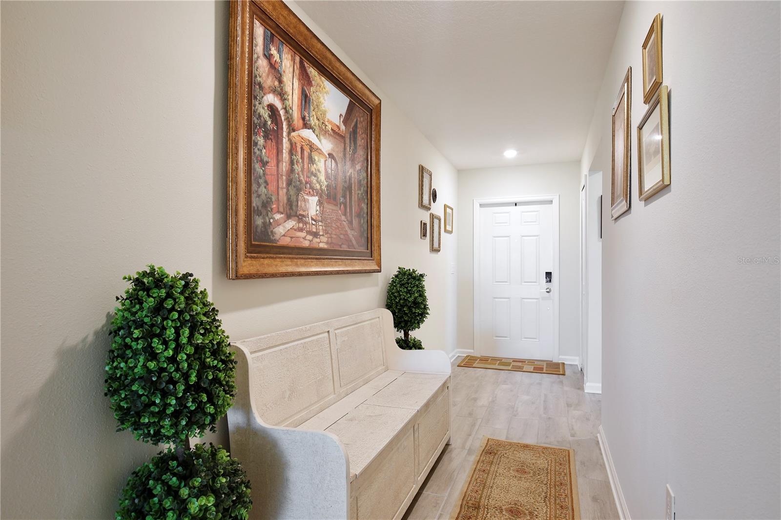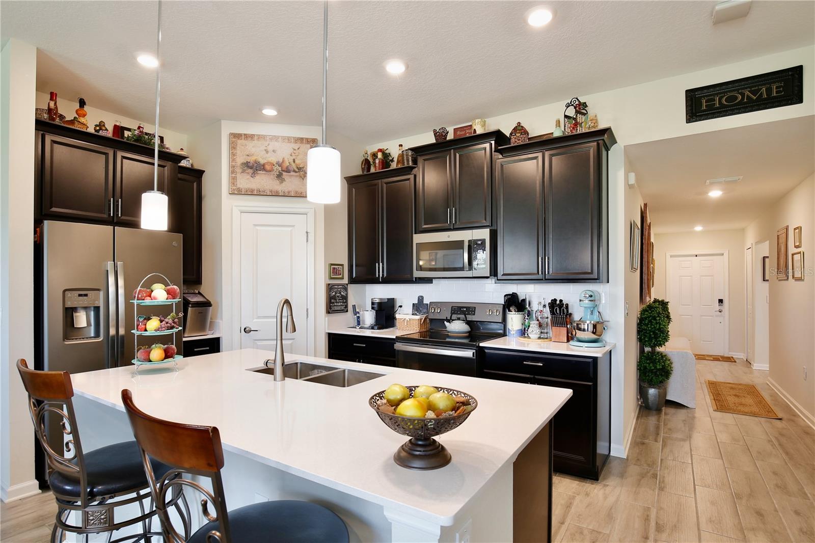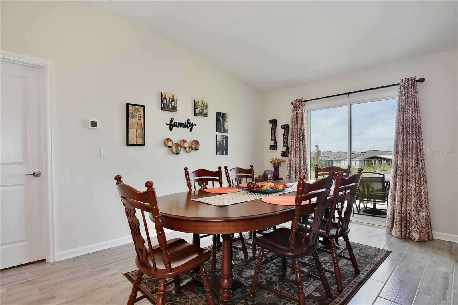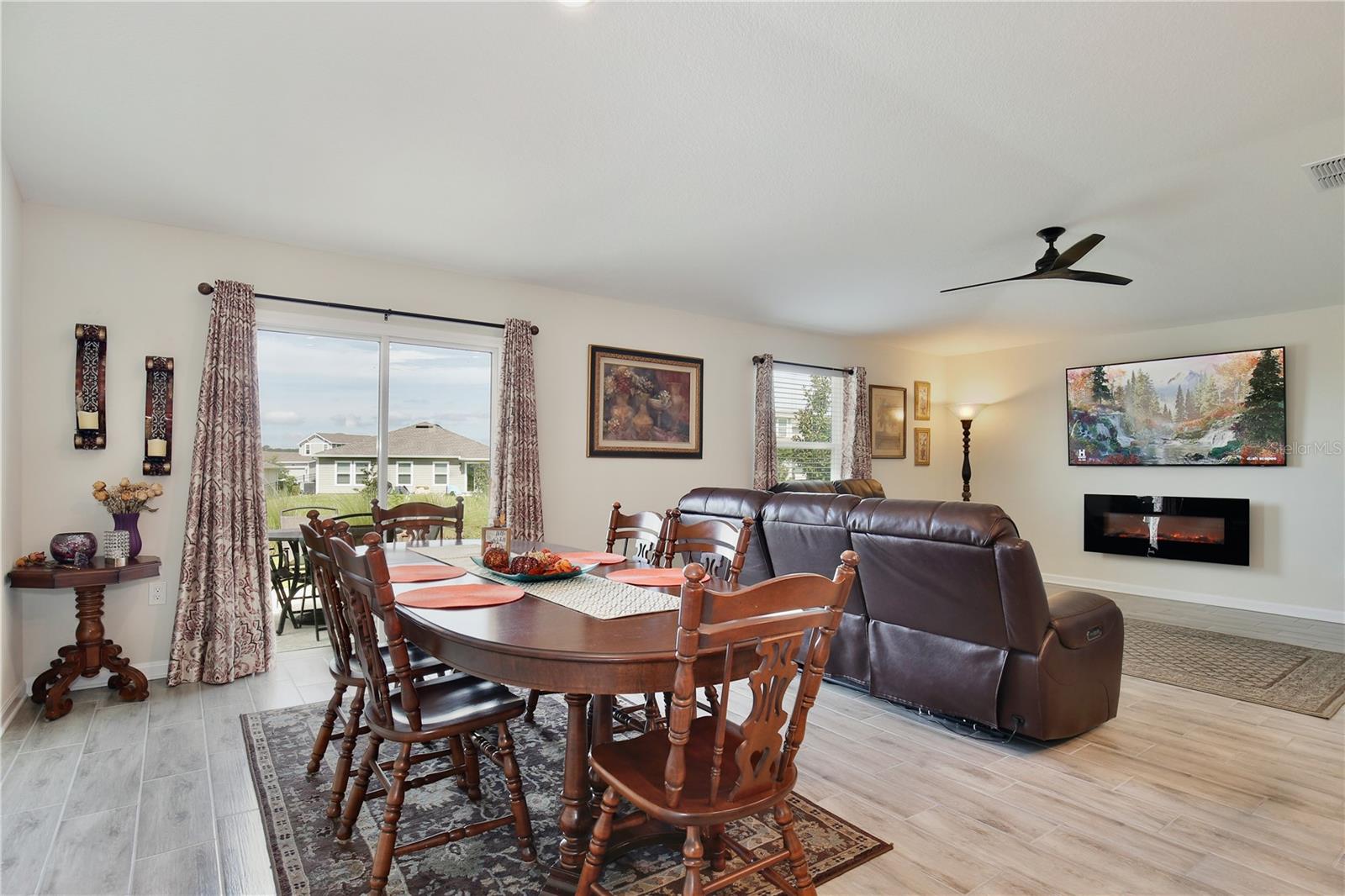 Discover the epitome of comfort and style in this stunning three bedroom, two bathroom house nestled within the serene Stoneybrook Hills gated community. Boasting eye catching curb appeal and meticulous landscaping, this home greets you with a warm embrace. Step inside to an open floor plan, where tall vaulted ceilings and neutral colors create an airy and spacious ambiance. The wood style floors complement the abundant natural light that pours in. The heart of this residence is the chef inspired kitchen, equipped with gleaming stainless steel appliances, a center island with bar top seating under pendant lights, ample pantry storage, granite countertops, and mocha shaker cabinets. The adjacent dining room offers the perfect transition to the outdoors with sliding glass doors that lead to a patio, an ideal setting for social gatherings, barbecues, or peaceful evenings. Relax in the spacious living room, which conveys a television and an electric fireplace. A large primary suite awaits, complete with a walk in closet and an en suite bath featuring dual sinks and a sleek glass door shower. Two additional bright and welcoming guest bedrooms along with a guest bath, featuring a tub/shower combo, provide comfort for family or visitors. The practical laundry room includes a washer and dryer and provides direct access to the generous two car garage. Step outside to a backyard haven, where a patio adorned with fire columns offers a cozy retreat on chilly nights. Residents of Stoneybrook Hills enjoy a plethora of amenities including a community swimming pool, splash pad, basketball court, pickleball courts, and a playground. Conveniently located just a stone's throw from a Publix plaza and with quick access to highways 429 and 441, this home is also a mere four miles from the enchanting downtown area of Mount Dora, known for its quaint boutiques, restaurants, and wine walks. Immerse yourself in the 3D tour and seize the opportunity to schedule a showing today for a lifestyle enveloped in comfort, convenience, and charm!